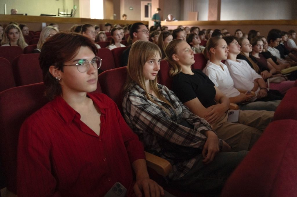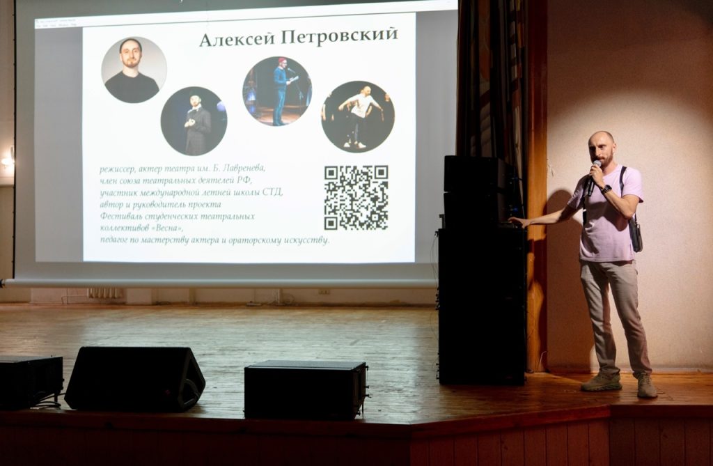 Перед тем как дать старт прохождению станций в Актовом зале всех первокурсников собрал заведующий актовым залом, руководитель театральной студии филиала «Драма Ломоносова» Алексей Федорович Петровский. Он кратко рассказал о возможностях, которые предоставляет КДЦ для студентов, анонсировал в будущем открытие небольшого кинозала, где студенты смогут собираться и смотреть фильмы (конечно же с учетом соблюдения законодательства РФ).
